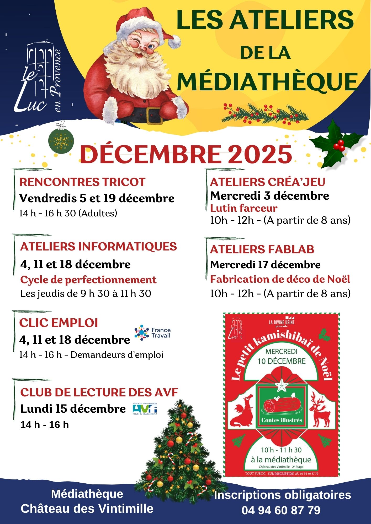 Les jeudis 45, 11 et 18 décembre, la municipalité vous invite aux ateliers clic emploi. De 14h à 16h à la médiathèque Réservé aux demandeurs d’emploi Inscriptions : 04 94 60 […]
